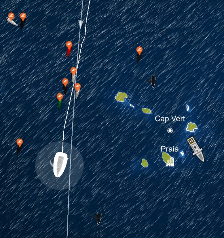 La grosse tache blanche marque les parages immédiats de ma position, dans l’Ouest des Îles du Cap Vert . La carte suivante précise cette position :