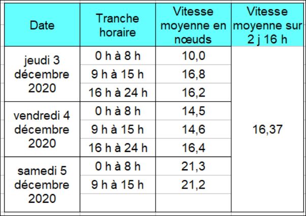 Depuis mon dernier billet, daté d’il y a quarante-huit heures, du 3 décembre donc, l’humeur d’Eole a enfin changée, et j’en ai fini avec les calmes dus à l’énorme anticyclone de Saint-Hélène, comme le montre les tableau statistique suivant :