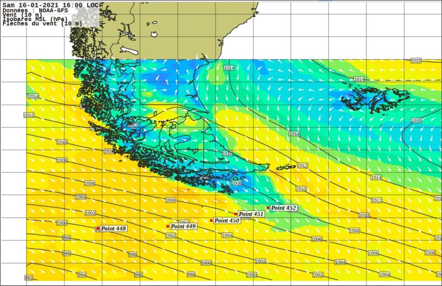 C’est l’archipel des Malouines — les Falklands — pour les Argentins, que vous voyez au Nord-Ouest . La carte météo ci-dessous vous donne une idée du temps qu’on rencontre dans ces parages. Si vous n’êtes pas à l’aise pour lire cette carte, n’hésitez pas à vous plonger dans les dix billets récents que j’ai consacrés dans ce blog à la tâche de vous éclairer sur ce sujet .