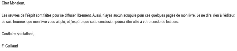 C’est pourquoi, avant que vous vous lanciez dans la découverte de ce grand texte, c’est avec le plus grand plaisir et avec encore davantage de reconnaissance que j’adresse ici tous mes remerciements à Frédéric Guillaud, pour la rapidité et la chaleur de sa réponse favorable, réponse que je vous livre ici, car elle s’adresse aussi à vous ;